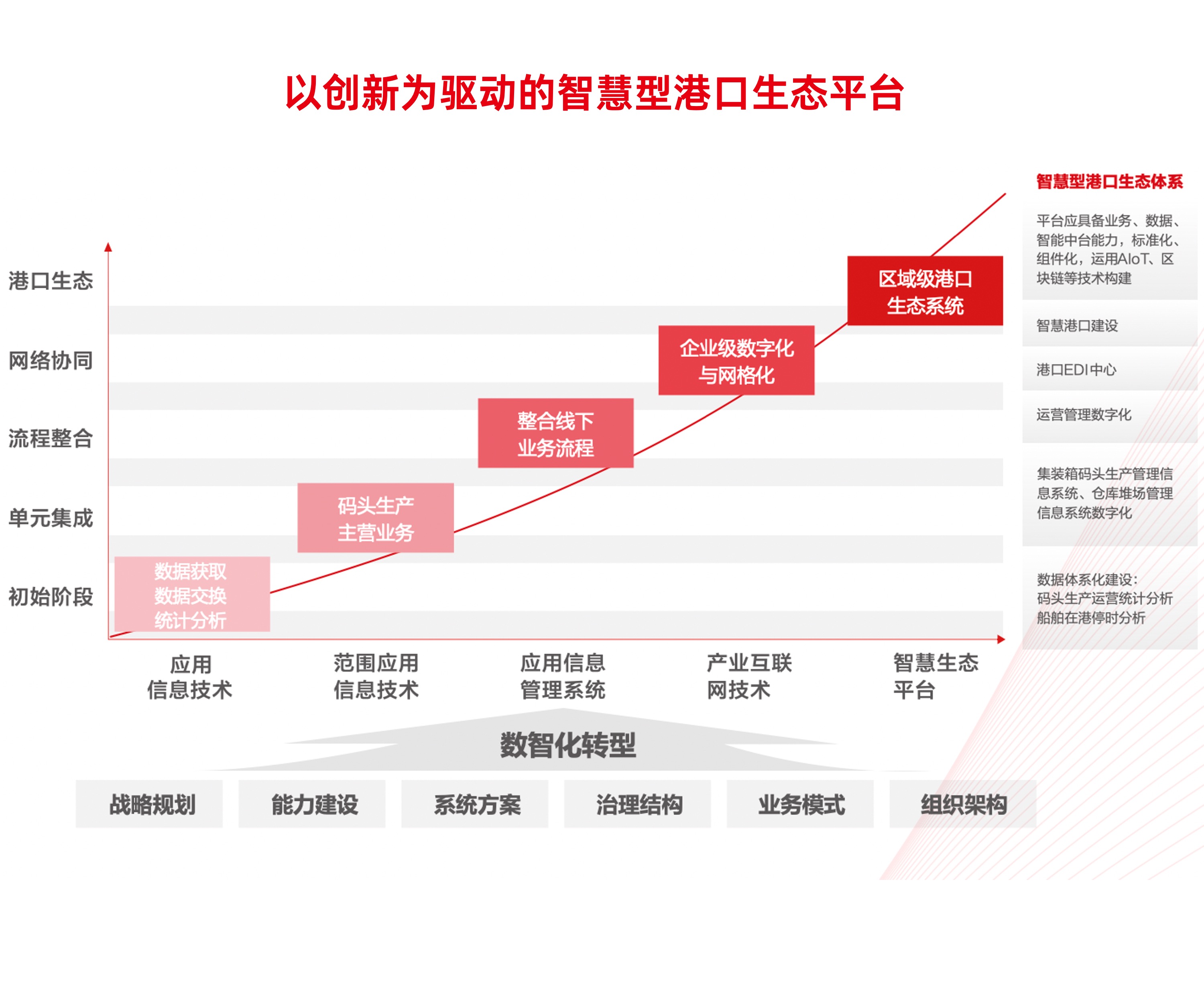 根据港口企业经营特性,构建覆盖港口建设和运营等为主的整体数智化解决方案,涉及“集团人财物、投建管养营、港口及码头生产业务、大数据分析”等业务,通过建设港口企业整体数智化平台,强化集团公司管控力度,实现集团各部门与区域、各成员子公司的战略协同。