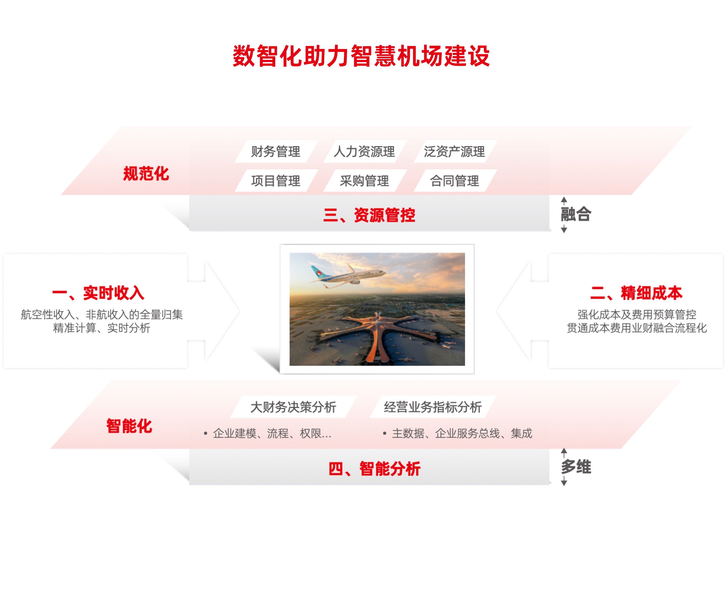 用友立足智慧机场的建设要求,结合机场行业管理体制多样化,资源管控集团化的管理模式,运用数智化技术,从实时收入(航空性收入、非航收入的全量归集)、精细成本(强化成本及费用预算管控,贯通成本费用业财融合流程化)、资源管控(财务、人力、资产、项目、采购、合同等涉及企业内部资源管理的各板块数智化管理)、智能分析四大方面,支撑机场行业的数智化转型。