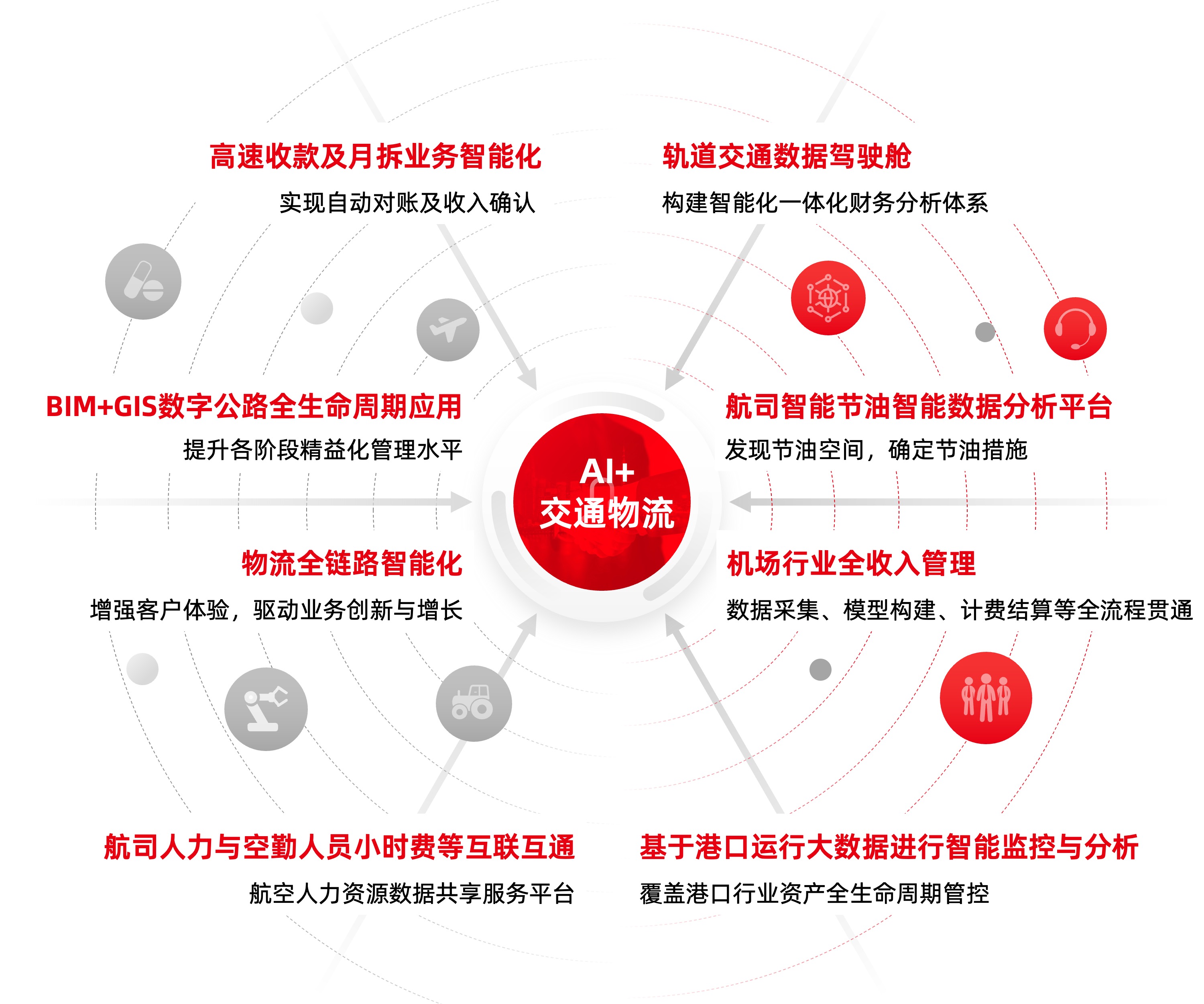 用友BIP将AI与高速交投、轨道公交、航空、机场、港口、物流快递等行业的业务场景深度融合,构建AI+全场景智能服务,实现全新的价值升级,为交通强国建设贡献数智力量。