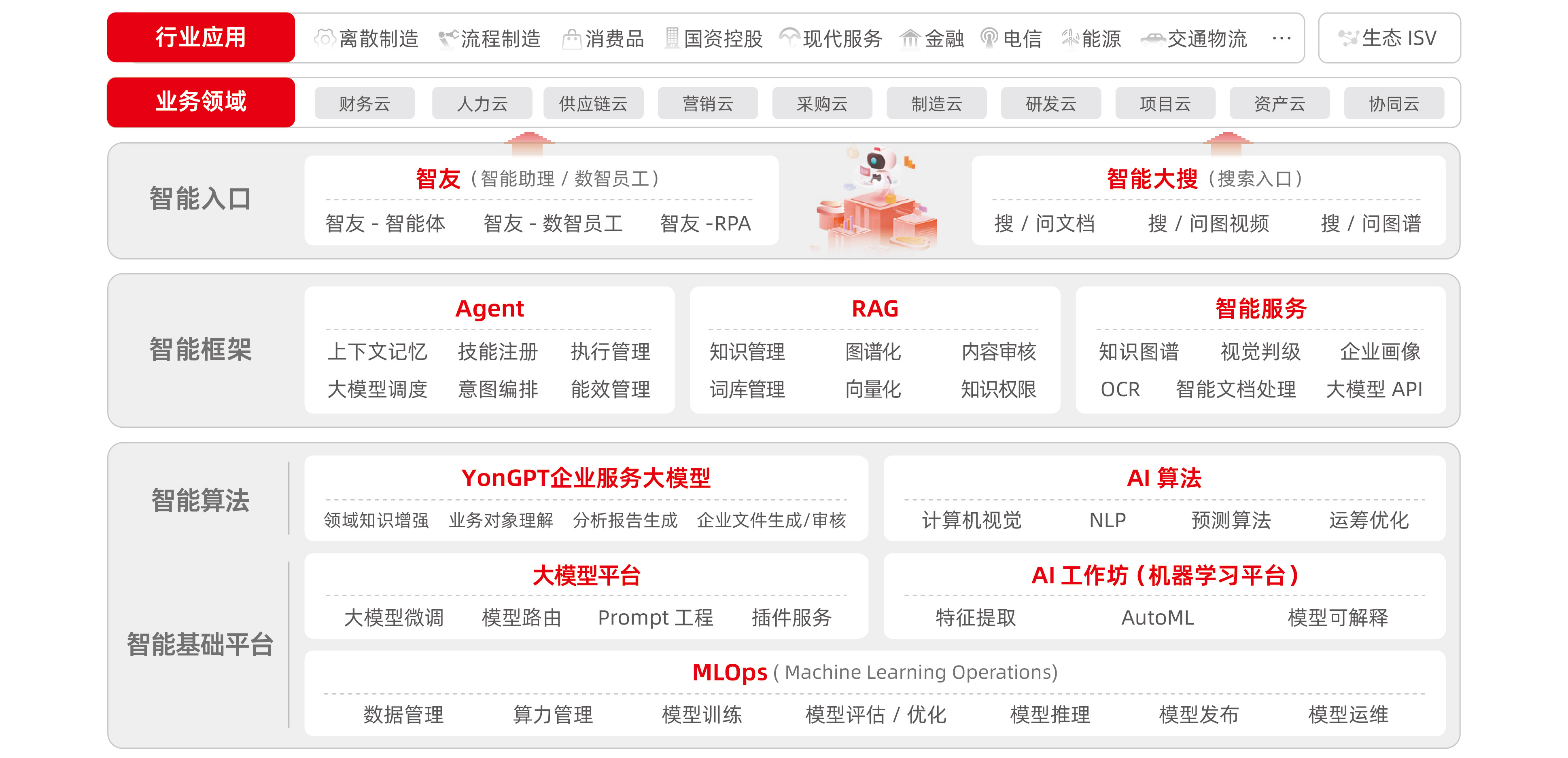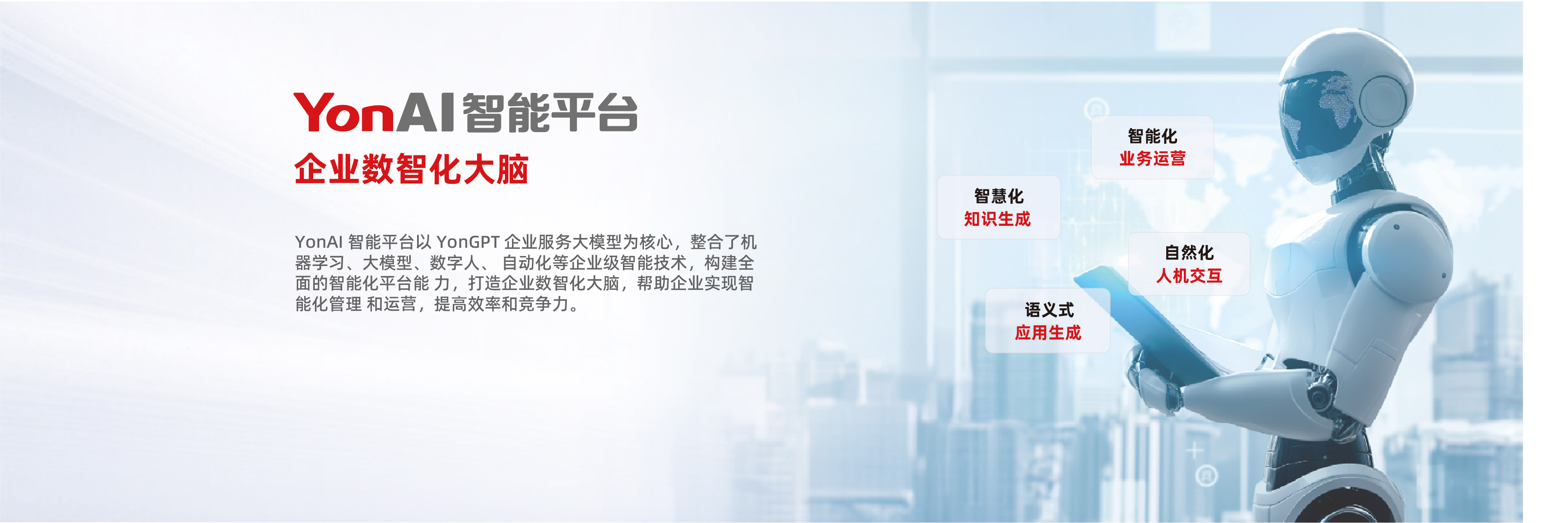 YonAI智能平台:企业数智化大脑。 YonGPT 用友企业服务大模型是业界首个企业服务大模型,可以为企业提供智能化的人机协作、业务洞察、商业决策支持和智能运营服务,是深懂企业服务的垂类大模型。
